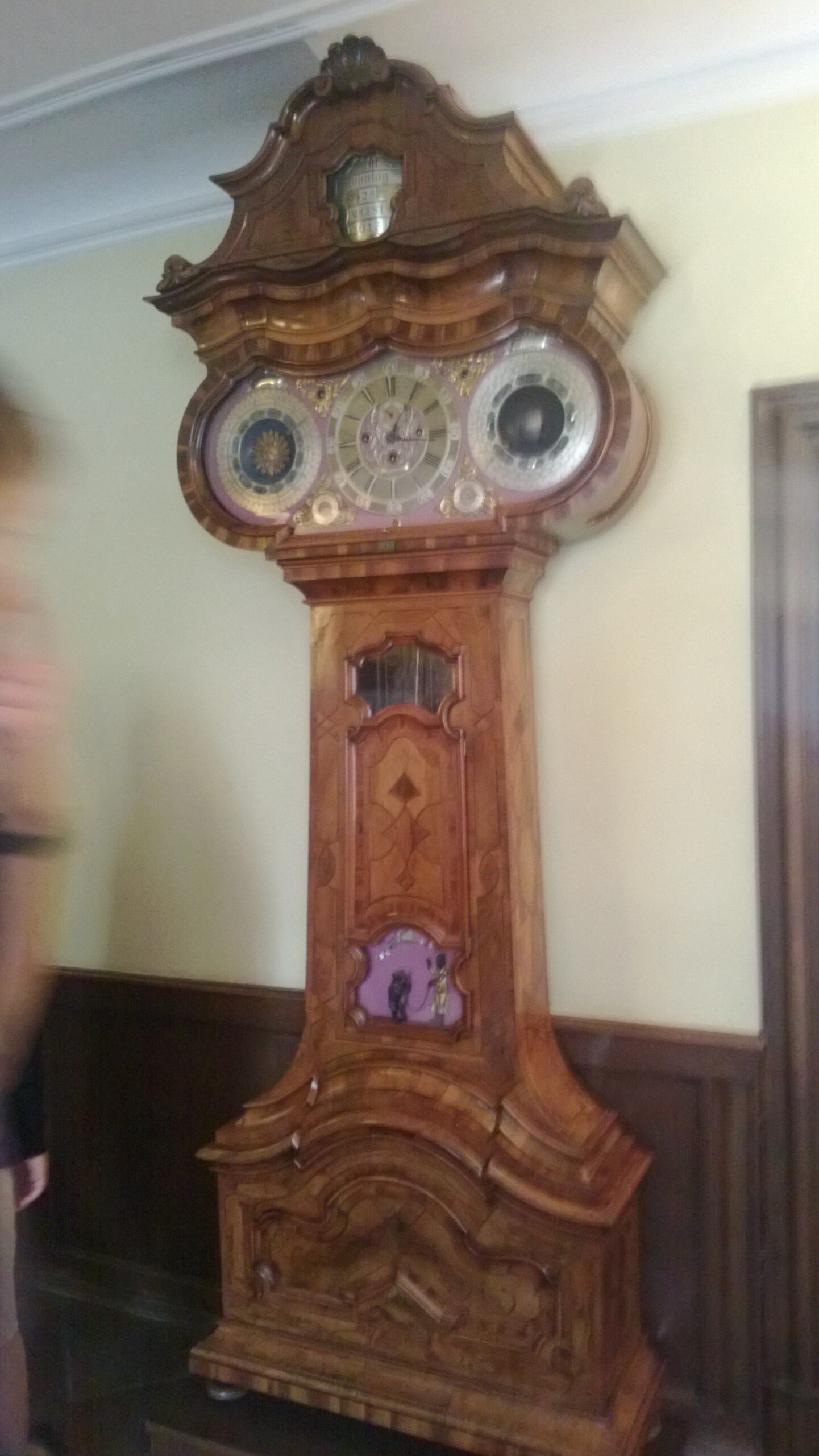 Nimmt man die Treppe ins erste Obergeschoß kommt einem sofort die astronomische Uhr entgegen. Im Flur selber findet man noch einen großen Wäscheschrank, der soviel Wäsche aufbewahren konnte, dass die Goethes während eines Jahres nicht oft waschen lassen mussten. Weitere Zimmer im ersten Obergeschoß sind ein festlich eingerichtetr Saal, das Peking-Zimmer mit Seitenkabinetten, sowie ein Musikzimmer und Kaminzimmer.