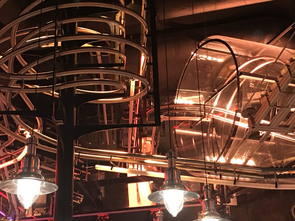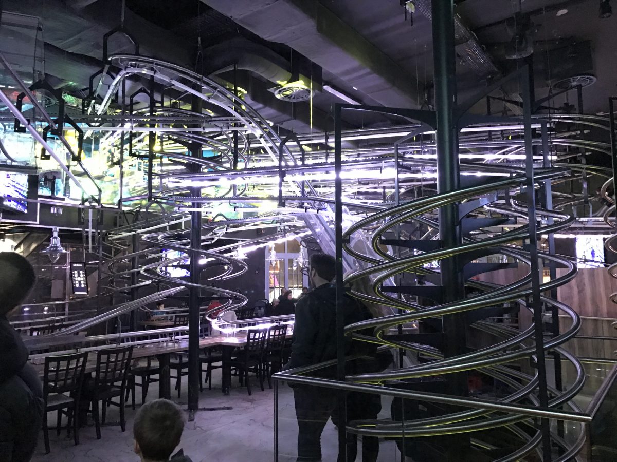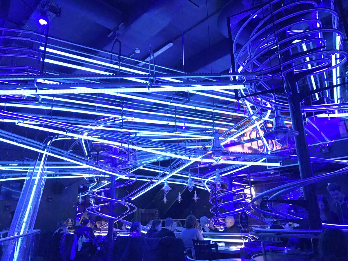 In regelmäßigen Abständen sorgen Lichtershows für Entertainment. Dann wird der Raum abgedunkelt und die Schienensystem stehen leuchtend im Mittelpunkt. Die Roboter bieten eine Tanzeinlage und mixen live Cocktails.