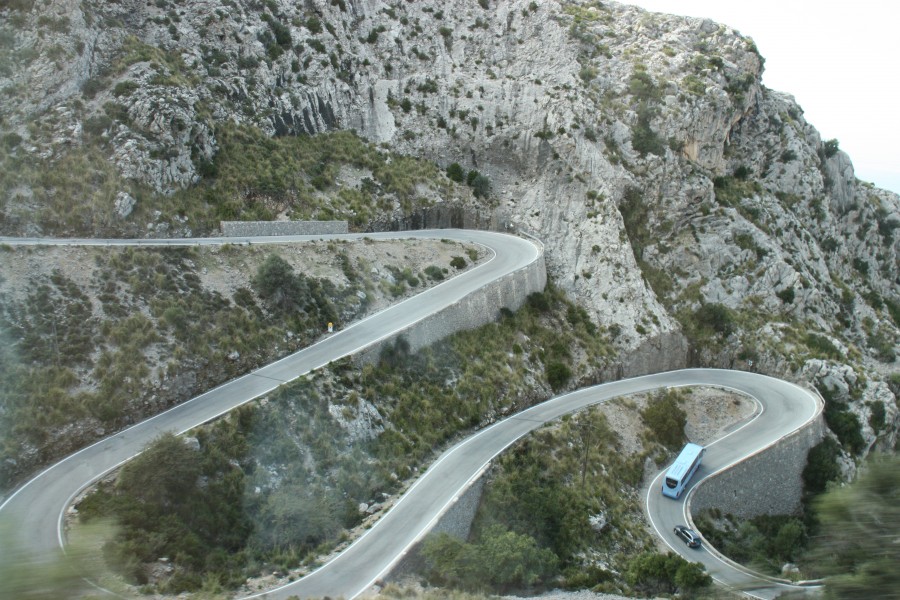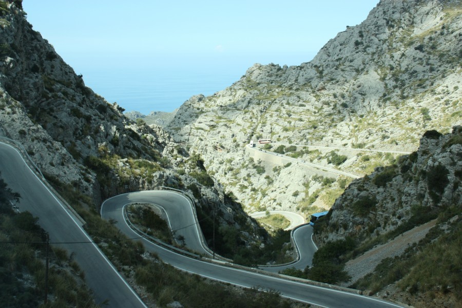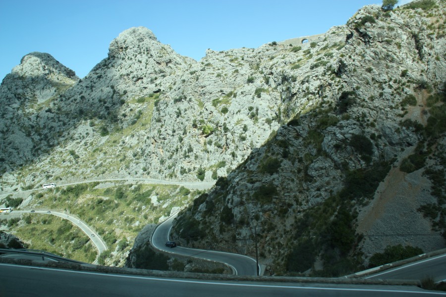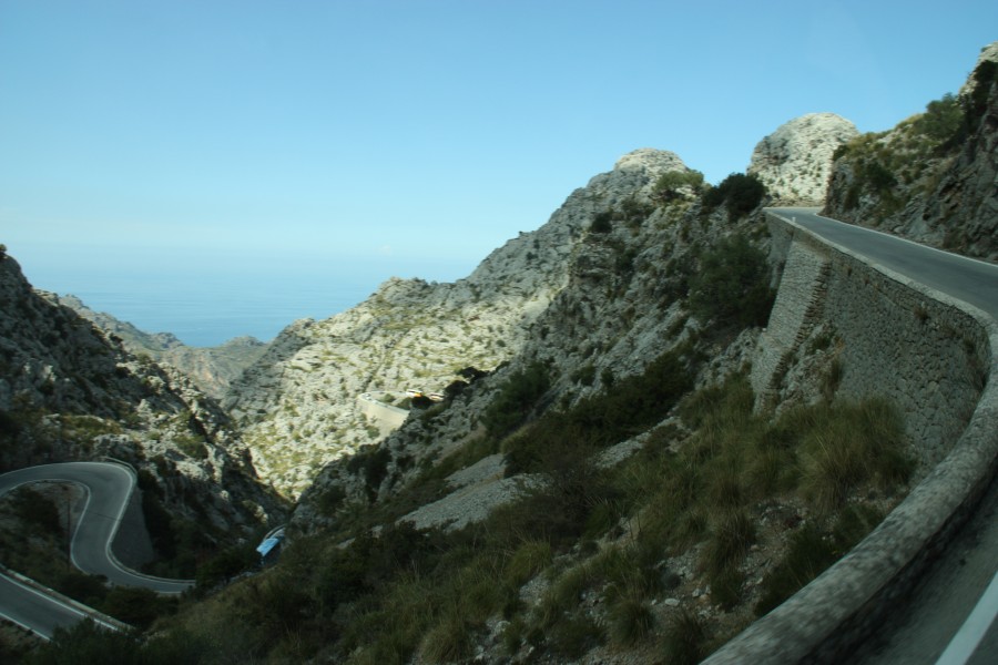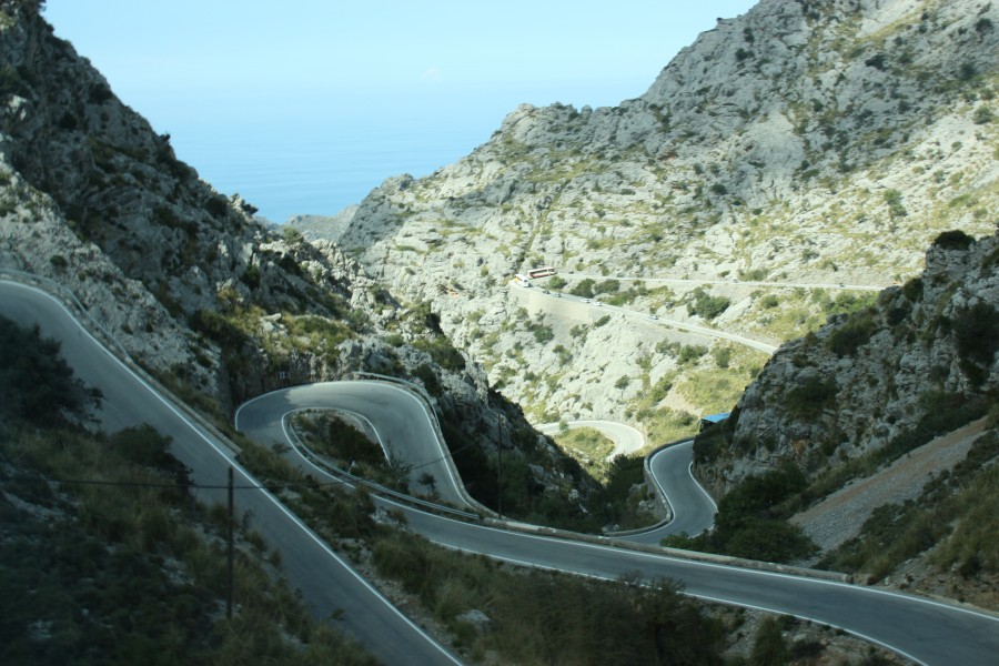 Von da an schlengelt sich die Straße 800 Meter in die Tiefe. Zahlreiche Haarnadelkurven müssen auf dem Weg nach Sa Calobra passiert werden. Insgesamt zieht sich der als Schlangenstraße benannte Paß durch 12 enge Kurven. Diese verlangen von den Fahrern trotz spektakulärer Aussichten höchste Konzentration. Besonders eng wird es wenn Reisebusse Touristen nach oder von Sa Calobra transportieren.