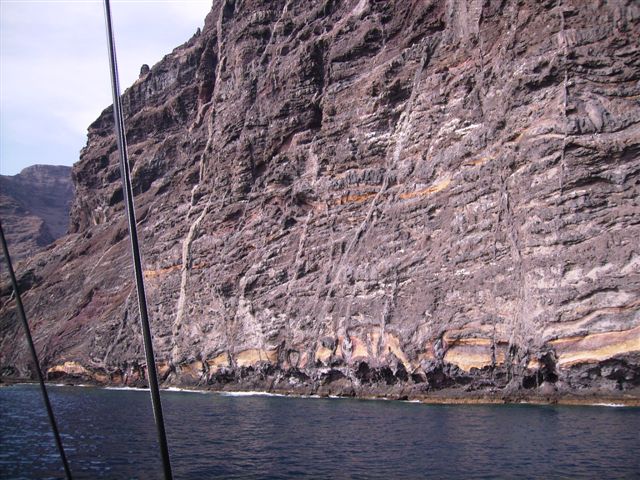 Der Blick auf die Steilküste öffnet dabei eine Sicht auf die unterschiedlichen Gesteinsschichten, die sich entlang der bis zu 600 Meter hohen Steilwände offenbart. Am Fuße der Steilküste liegt das Meer vor Teneriffa und bietet in schönsten Blautönen einen herrlichen Kontrast zu den atemberaubenden Steilwänden.