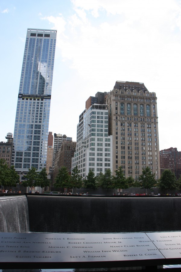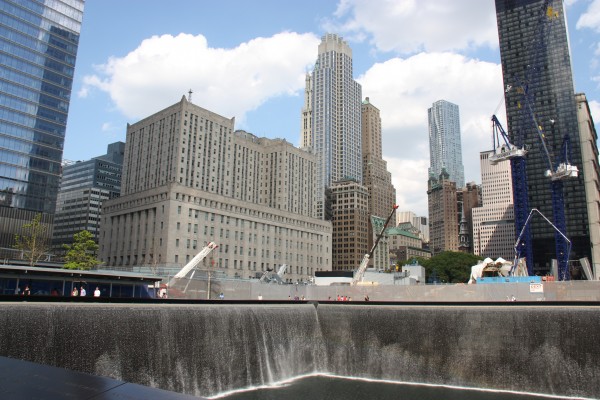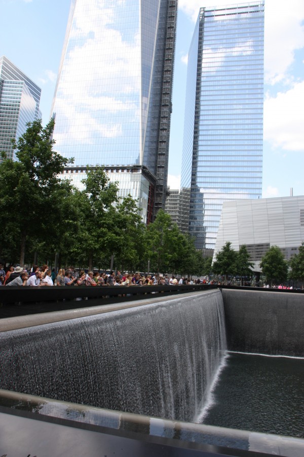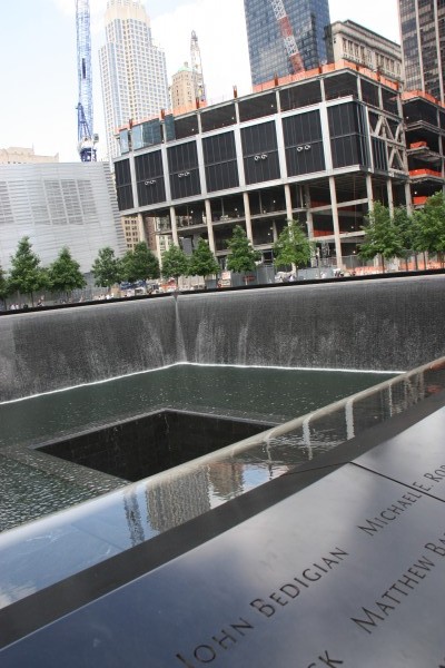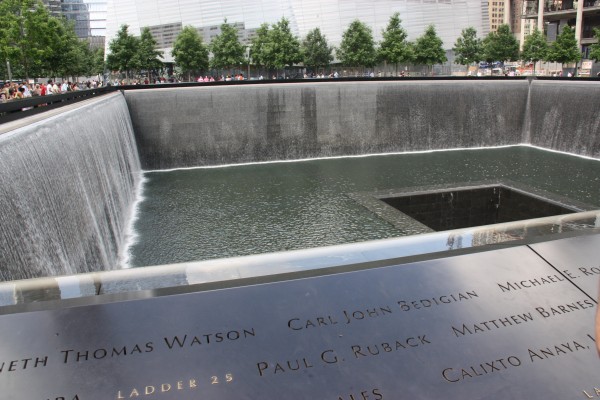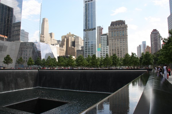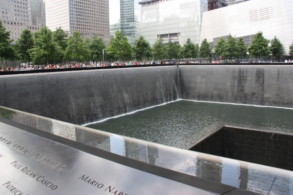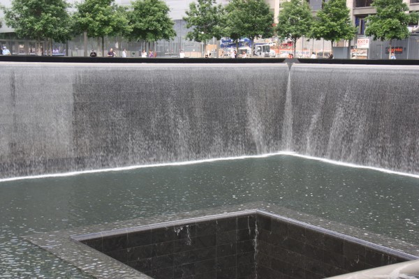 Als Mahnmal wurde die Gedenkstätte „National September 11 Memorial“ in New York erbaut. An genau der Stelle, an der damals die beiden Türme des World Trade Centers standen, wurden die beiden Becken geschaffen. Diese Pool-Becken kennzeichnen damit quasi als Fußabdruck die damaligen Grundrisse der beiden Tower des World Trade Centers. Ein 9 m hoher Wasserfall stürzt in die Tiefe des Beckens und gilt damit als größter künstlicher Wasserfall in den USA. In den Beckenrand wurden die Namen sämtlicher Todesopfer der Anschläge eingraviert.